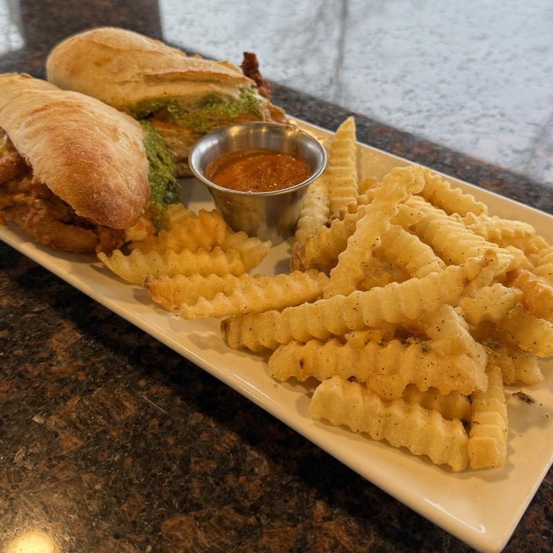 Chicken Cutlet, housemade vodka sauce, basil pesto, mozzarella, provolone, warm baguette, ranch fries.
