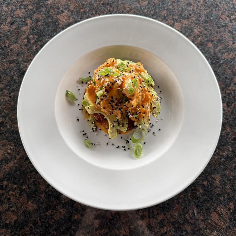 Ahi tuna, avocado, sriracha-wasabi sauce, jalapeno, on top of crispy rice cakes.