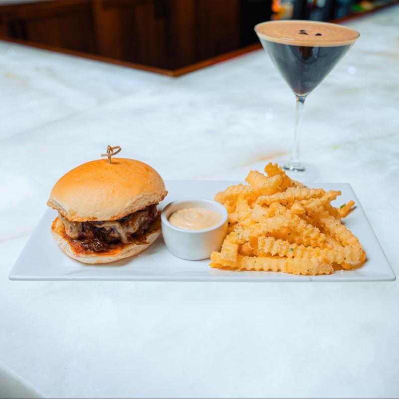 Two Grilled beef patties, house made bacon jam, garlic aioli, white cheddar, buttered brioche bun, garlic parmesan fries.