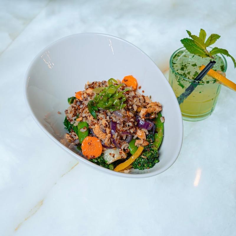 Sesame brown rice and red quinoa, mixed vegetables, sesame ginger soy sauce. Choice of chicken or steak.