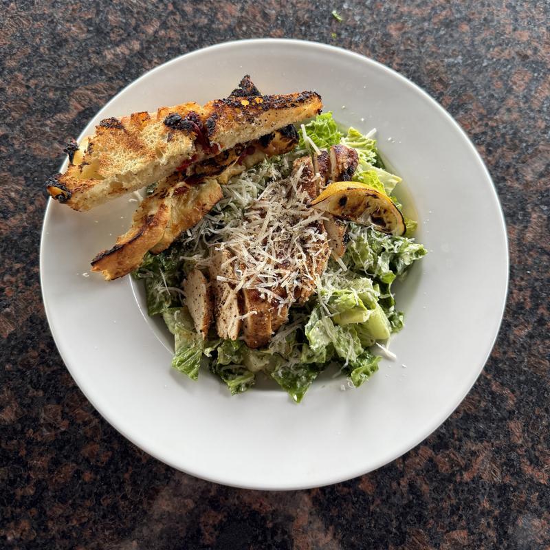 Grilled Chicken Breast over crisp romaine, house made Caeser dressing, freshly shaved parmesan, sliced focaccia.